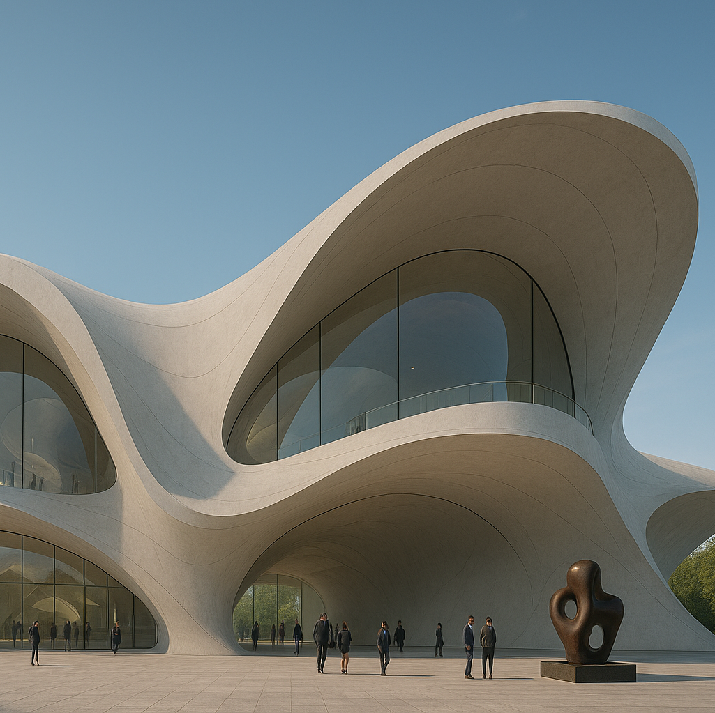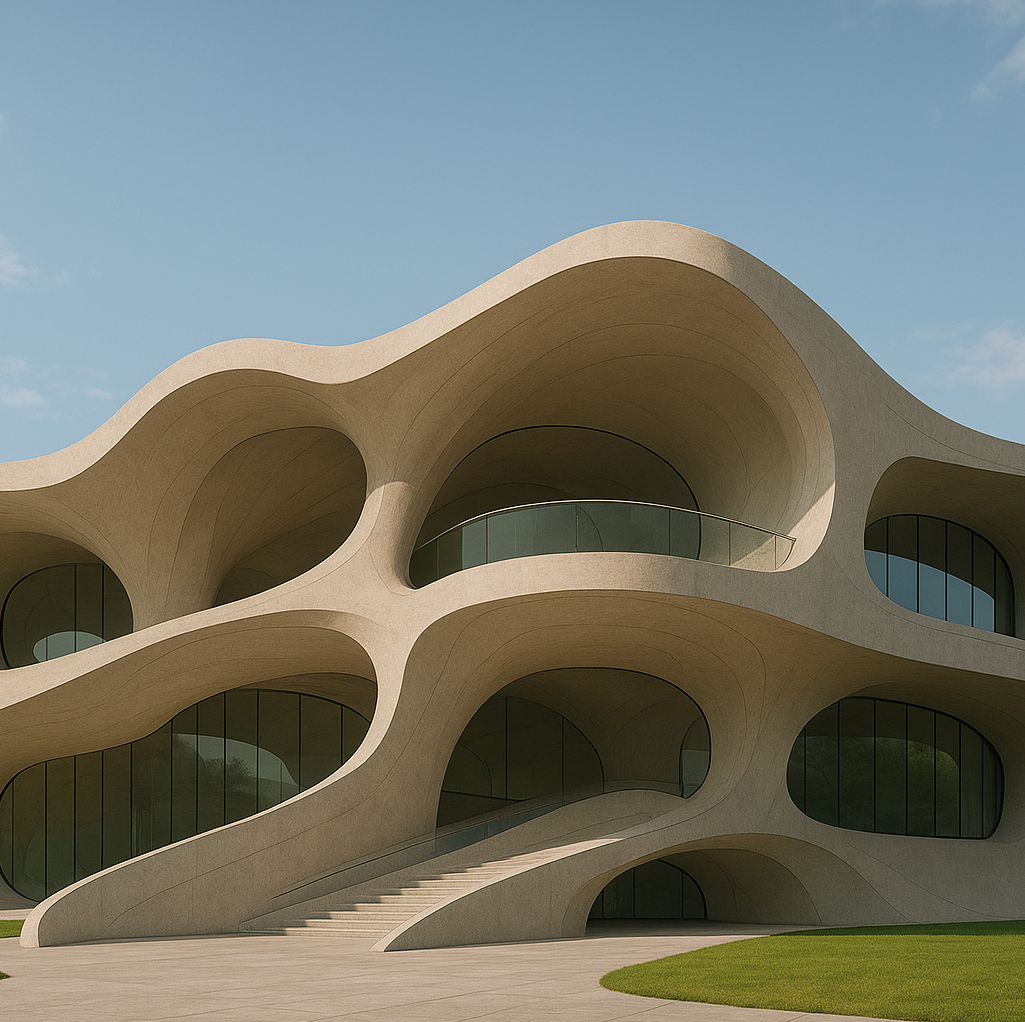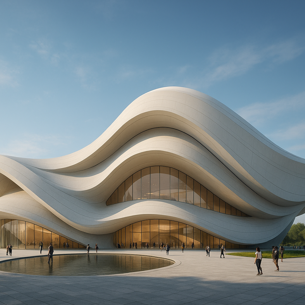 Visitors approaching the museum often pause, unsure whether they are stepping into a building or into a sculpted fragment of the earth itself. The facade, with its undulating forms, seems to ripple like frozen waves, inviting the eye to wander endlessly along its folds. There are no sharp edges here only gestures of fluidity, as though the structure has been shaped by centuries of wind and water. Inside, the curves deepen into an orchestration of movement. Staircases sweep like ribbons suspended in air, guiding guests upward without a sense of interruption. Ramps spiral gently around an atrium that glows with filtered daylight pouring through elliptical skylights. Every line bends, every surface arcs, and yet there is harmony: a dialogue between light, shadow, and stone. The building becomes less of an object and more of an experience. The curves are not decoration—they are the language of the museum itself. They soften boundaries between wall and ceiling, between structure and atmosphere, and between visitor and space. Walking through, one feels embraced, carried, and released, as though the architecture itself is breathing. In this museum, the curves do not simply define form; they tell a story of continuity of nature flowing into culture, of space flowing into human memory
